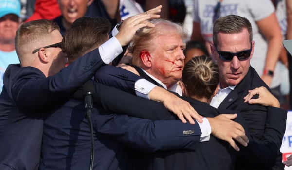 Selepas tembakan,Trump dilihat memegang telinga kanan,kemudian menurunkan tangannya ke bawah,sebelum melutut untuk berlindung di belakang podium.