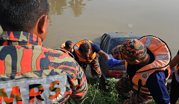 Anggota bomba sedang mengangkat kereta yang ditemukan di dalam Sungai Korok,pagi ini.