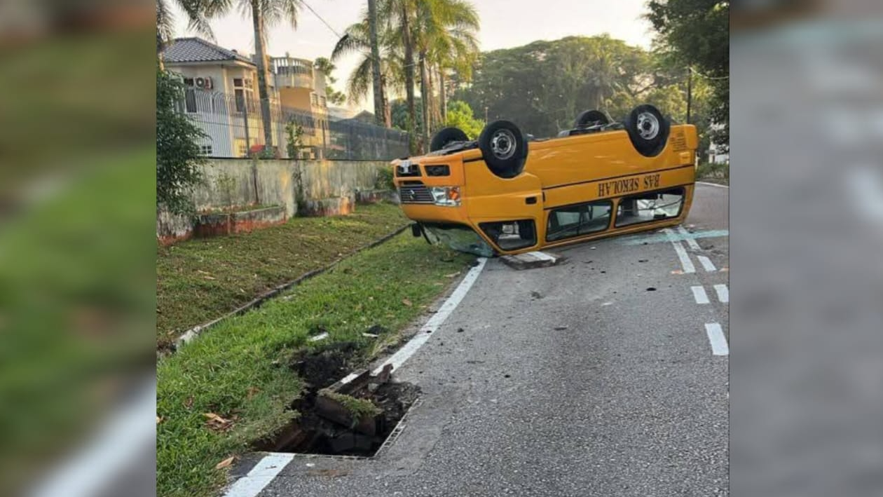 Sebuah bas sekolah terbalik selepas terlanggar lubang pembetungan