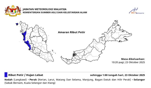 Jabatan Meteorologi Malaysia (MetMalaysia) dalam kenyataan memaklumkan,kawasan dijangka terjejas ialah Langkawi,Kedah manakala di Perak melibatkan Kerian; Larut,Matang dan Selama; Manjung; Bagan Datuk serta Hilir Perak.