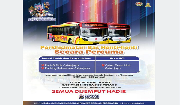 KUALA LUMPUR,18 Julai - Perkhidmatan bas henti-henti secara percuma disediakan kepada pengunjung sepanjang Majlis Pelancaran Bulan Kebangsaan dan Kibar Jalur Gemilang 2024 di Cyberjaya,Selangor pada Ahad ini.