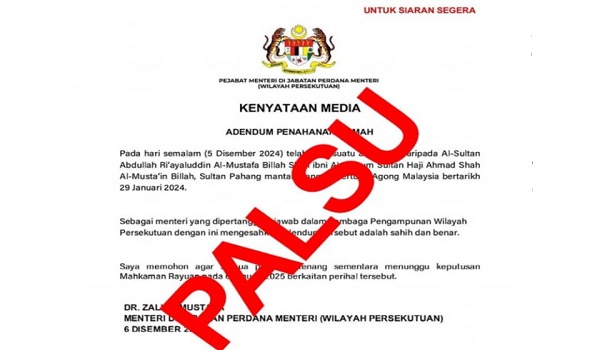 "Untuk makluman,kenyataan media ini adalah PALSU dan tidak pernah dikeluarkan oleh saya.