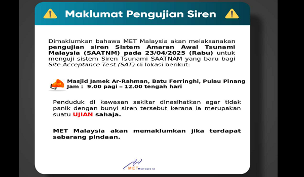 MetMalaysia menerusi hantaran Facebook memaklumkan ujian itu akan diadakan dari 9 pagi hingga 12 tengah hari dan sehubungan itu,penduduk di kawasan sekitar dinasihatkan untuk tidak panik dengan bunyi siren tersebut.