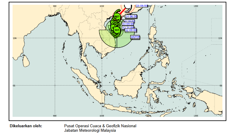 Dalam satu notis Nasihat Ribut Tropika yang dikeluarkan petang tadi,MetMalaysia menjelaskan ribut tersebut sedang bergerak ke arah barat laut dengan kelajuan sekitar lima kilometer sejam (km/j),manakala kelajuan angin maksimum dicatatkan pada 83 km/j.