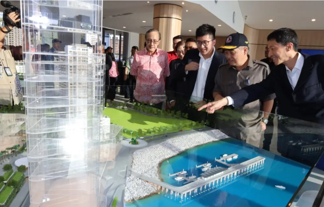 Ketua Pegawai Eksekutif Trillium Development Sdn Bhd Clement Chu (3 dari kiri) dan Ketua Pegawai Eksekutif Kumpulan Ming Keong Dr Zhu Jiantao (kanan) menjelaskan pelan projek pembangunan komprehensif Semenanjung Kota Kinabalu kepada Ketua Menteri Datuk Seri Haji Noor.