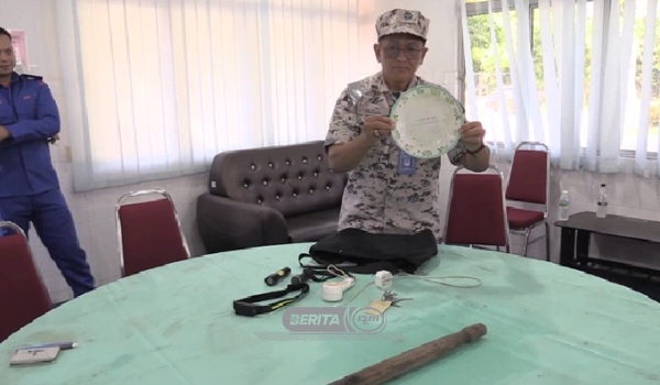 Selain itu turut ditemukan di lokasi kejadian ialah sebatang kayu cota dan sebiji pinggan milik tekong bot.