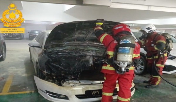 Anggota bomba memadam kebakaran enjin sebuah kereta di tingkat bawah sebuah kondominium di Wangsa Maju,pagi tadi.