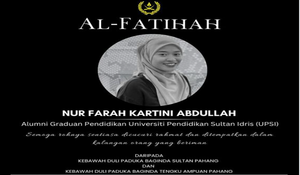 Menerusi hantaran di laman Facebook Kesultanan Pahang,baginda berdua turut mendoakan agar roh Nur Farah Kartini yang juga alumni Universiti Pendidikan Sultan Idris (UPSI) ditempatkan bersama-sama orang yang beriman.