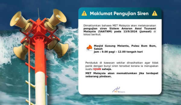 MetMalaysia menerusi kenyataan berkata,pengujian siren itu akan dilaksanakan di Masjid Gusung Melanta,Pulau Bum Bum,Sabah pada pukul 9 pagi hingga 12 tengah hari.