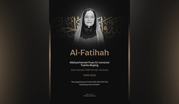 KUALA LUMPUR,23 Jun- Yang di-Pertuan Agong,Sultan Ibrahim menzahirkan ucapan takziah atas pemergian isteri kepada Premier Sarawak,Tan Sri Abang Johari Abang Openg iaitu Puan Sri Juma'ani Tuanku Bujang.