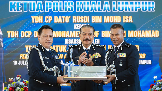 Datuk Rusdi Mohd Isa (kiri) menyerahkan tongkat kuasa kepada Datuk Mohamed Usuf Jan Mohamad (kanan) sambil disaksikan Pengarah Jabatan Intergriti dan Pematuhan Standard Bukit Aman,Datuk Hamzah Ahmad (tengah) / Foto BERNAMA