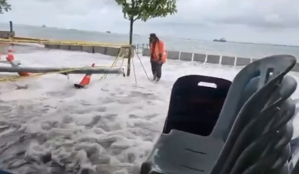 GEORGE TOWN,18 September- Pertembungan angin kencang dan air pasang tinggi menyebabkan air laut melimpah masuk ke medan selera di sepanjang persisiran pantai Pulau Pinang.