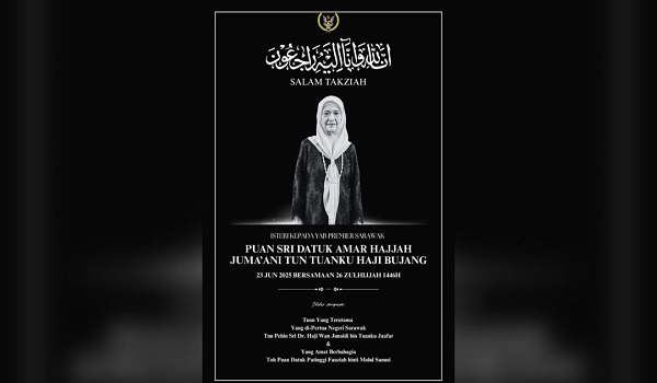 KUCHING,23 Jun- Yang di-Pertua Negeri Sarawak,Tun Pehin Sri Dr. Wan Junaidi Tuanku Jaafar dan isteri,Toh Puan Datuk Patinggi Fauziah Mohd Sanusi menzahirkan ucapan takziah kepada Premier Sarawak,Datuk Patinggi Tan Sri Abang Johari Tun Openg atas pemergian Allahyarhamah Puan Sri Datuk Amar Juma'ani Tuanku Bujang.