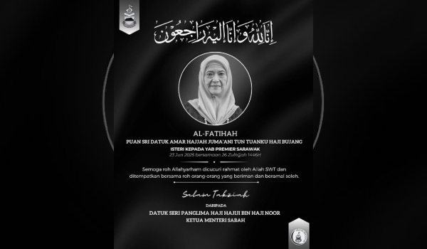 "Kerajaan Negeri Sabah turut merasai kesedihan dan menzahirkan doa serta simpati yang mendalam kepada YAB Premier sekeluarga dalam saat penuh duka ini.