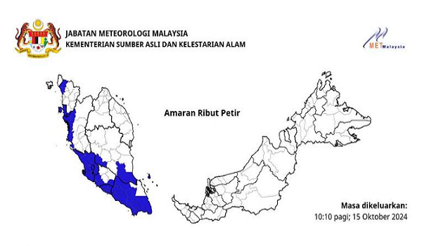 KUALA LUMPUR,15 Oktober- Jabatan Meteorologi Malaysia (MetMalaysia) mengeluarkan amaran ribut petir bagi lapan negeri dan Wilayah Persekutuan Kuala Lumpur serta Putrajaya sehingga 1 tengah hari ini.