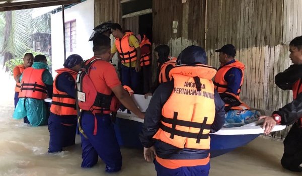 Anggota APM Pasir Puteh mengeluarkan penduduk yang terperangkap di Kg Bukit Abal/Foto APM