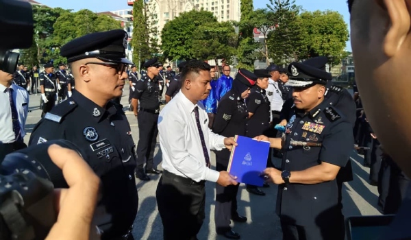 Ketua Polis Kelantan,Datuk Mohd Yusoff Mamat (kanan) ketika menyampaikan surat penghargaan kepada pegawainya atas khidmat cemerlang semasa Perhimpunan Bulanan Polis Kelantan hari ini