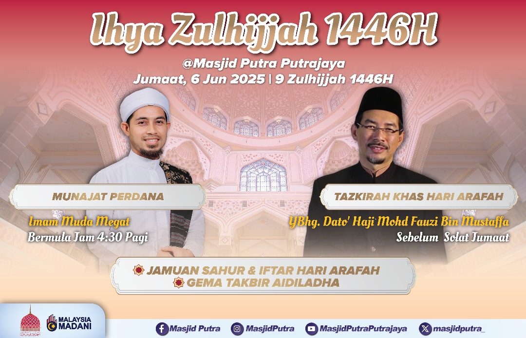 PUTRAJAYA,5 Jun - Munajat Perdana,Jamuan Sahur dan Iftar Hari Arafah serta Gema Takbir Aidiladha,antara pengisian rohani dalam program Ihya Zulhijjah 1446H yang akan diadakan esok di Masjid Putra,Putrajaya.