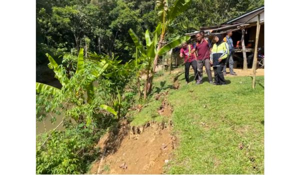 Kejadian tebing tanah terhakis dan runtuh turut merosakkan tanaman pokok pisang dan ubi kayu yang diusahakan penduduk kampung.
