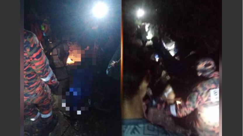 Mangsa dibawa turun oleh pihak bomba ke kaki Gunung Keriang pada pukul 9.30 malam sebelum disahkan meninggal dunia. / Foto ihsan bomba