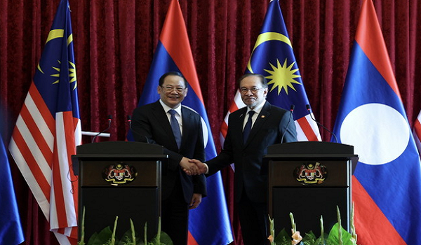 Perdana Menteri Datuk Seri Anwar Ibrahim (kanan) bersalaman dengan rakan sejawatannya dari Laos Dr Sonexay Siphandone (kiri),selepas mengadakan pertemuan empat-mata sempena lawatan rasmi tiga hari perdana menteri Loas itu ke Malaysia/ Foto BERNAMA