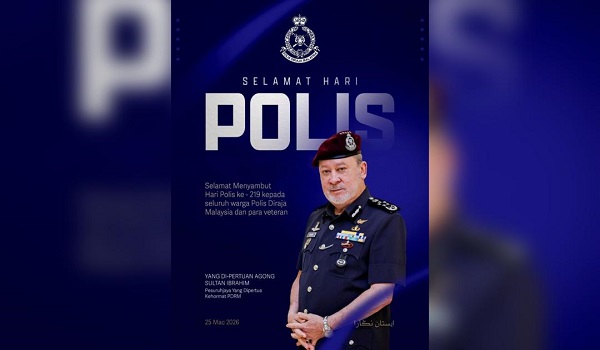 KUALA LUMPUR,25 Mac – Yang di-Pertuan Agong Sultan Ibrahim menzahirkan ucapan Selamat Hari Polis Ke-219 kepada seluruh warga Polis Diraja Malaysia (PDRM) serta para veteran.
