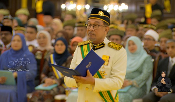 Datuk Seri Anwar menyampaikan Sembah Ucapan sempena Istiadat Menghadap dan Pengurniaan Darjah Kebesaran,Bintang dan Pingat Persekutuan 2024 sempena sambutan Ulang Tahun Keputeraan Rasmi Yang Di-Pertuan Agong di Istana Negara / FOTO RTM
