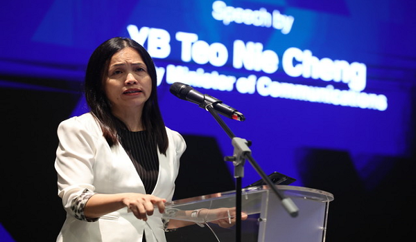 Timbalan Menteri Komunikasi Teo Nie Ching berucap pada Majlis Pelancaran Infrastruktur Al Strategik Malaysia hari ini / BERNAMA