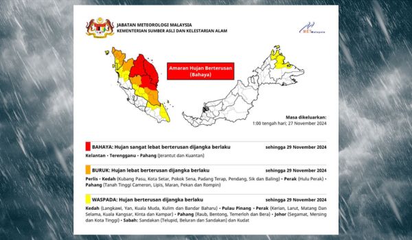 KUALA LUMPUR,27 November – Jabatan Meteorologi Malaysia (MetMalaysia) mengeluarkan amaran hujan sangat lebat tahap bahaya di Kelantan,Terengganu dan Pahang hingga Jumaat ini.
