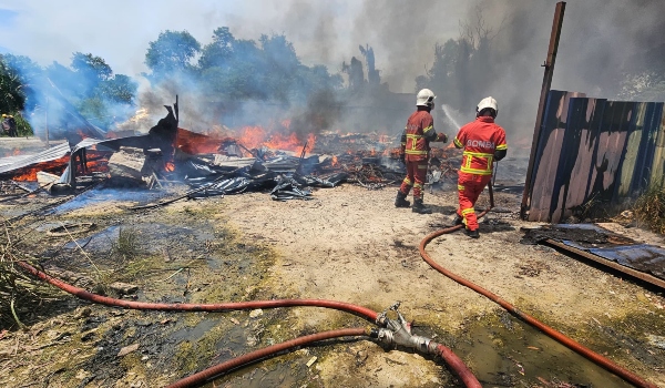Pasukan bomba sedang mengawal api kebakaran di lima blok rumah pekerja jenis tidak kekal di Jalan Bundusan,Penampang Baru/Foto BOMBA