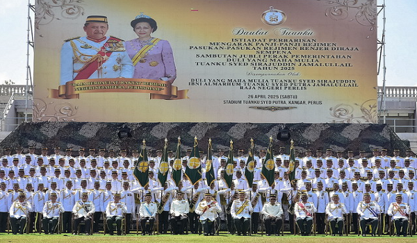 Raja Perlis Tuanku Syed Sirajuddin Jamalullail berkenan bergambar bersama anggota Kawalan Kehormatan Pasukan Rejimen Renjer Diraja pada Istiadat Perbarisan Mengarak Panji Panji Rejimen Pasukan Sempena Sambutan Jubli Perak Pemerintahan Baginda di Stadium Tuanku Syed Putra,Kangar / BERNAMA